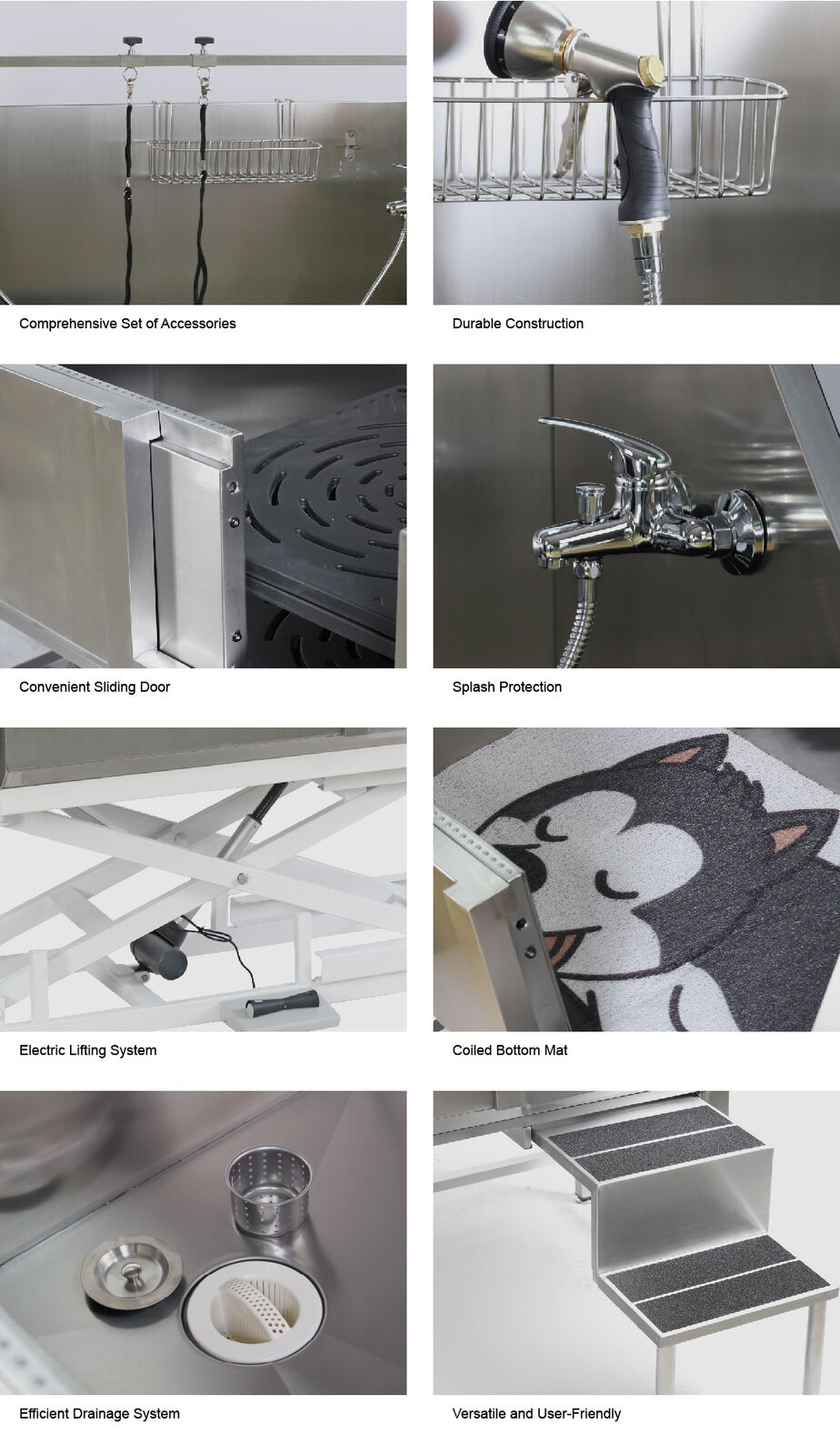 - Comfort and Safety: The electric lifting system and elevated grooming arm provide safe and comfortable handling of pets during bathing.