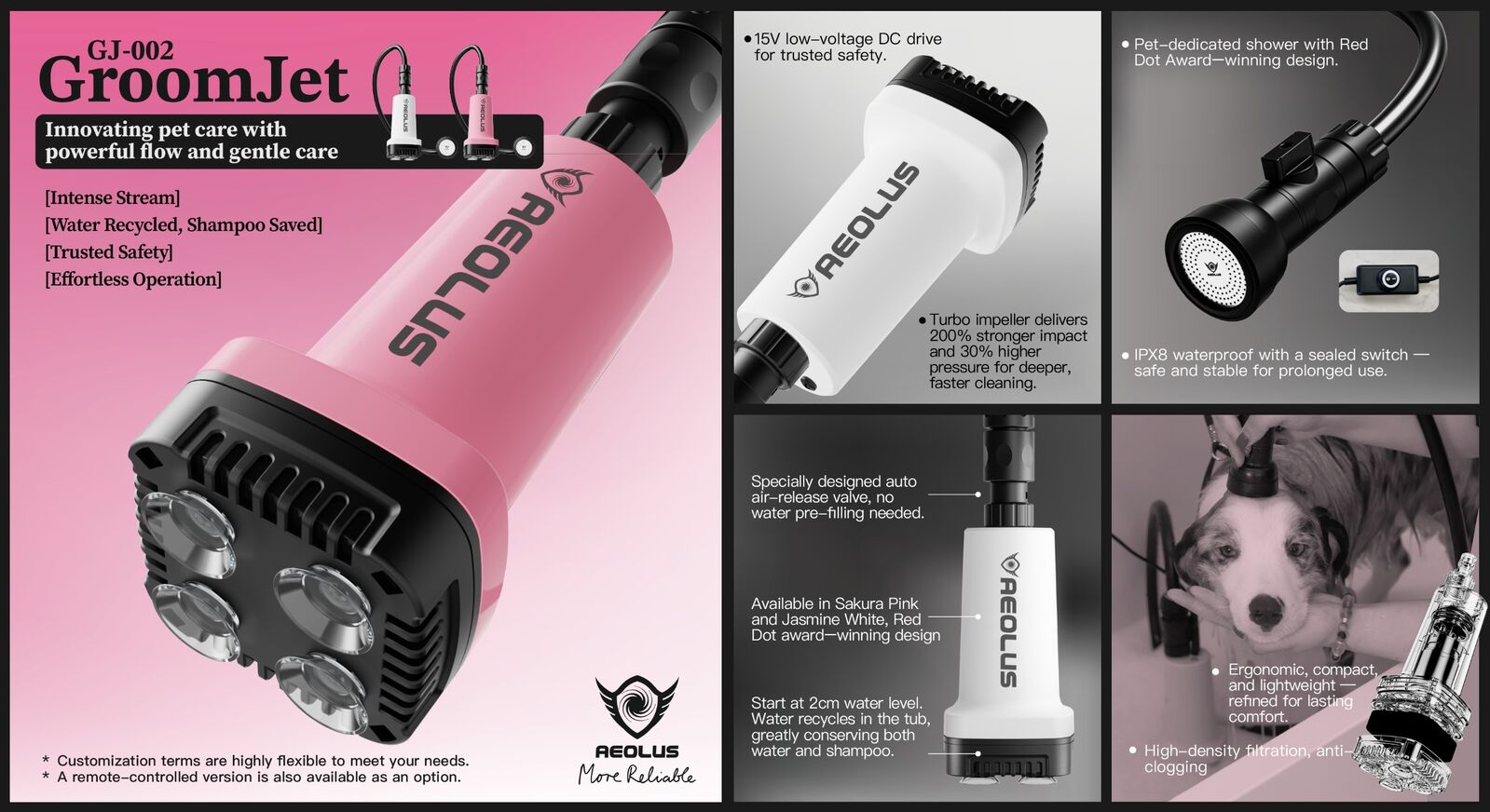 The GroomJetâ„¢ GJ-002 is engineered for professional groomers, veterinary clinics, shelters, and pet resorts that demand faster, deeper, and more economical bathing. Compact and submersible, it delivers a powerful yet gentle spray that penetrates thick coats, reduces rinse time, and saves water and shampoo, all while keeping pets comfortable.