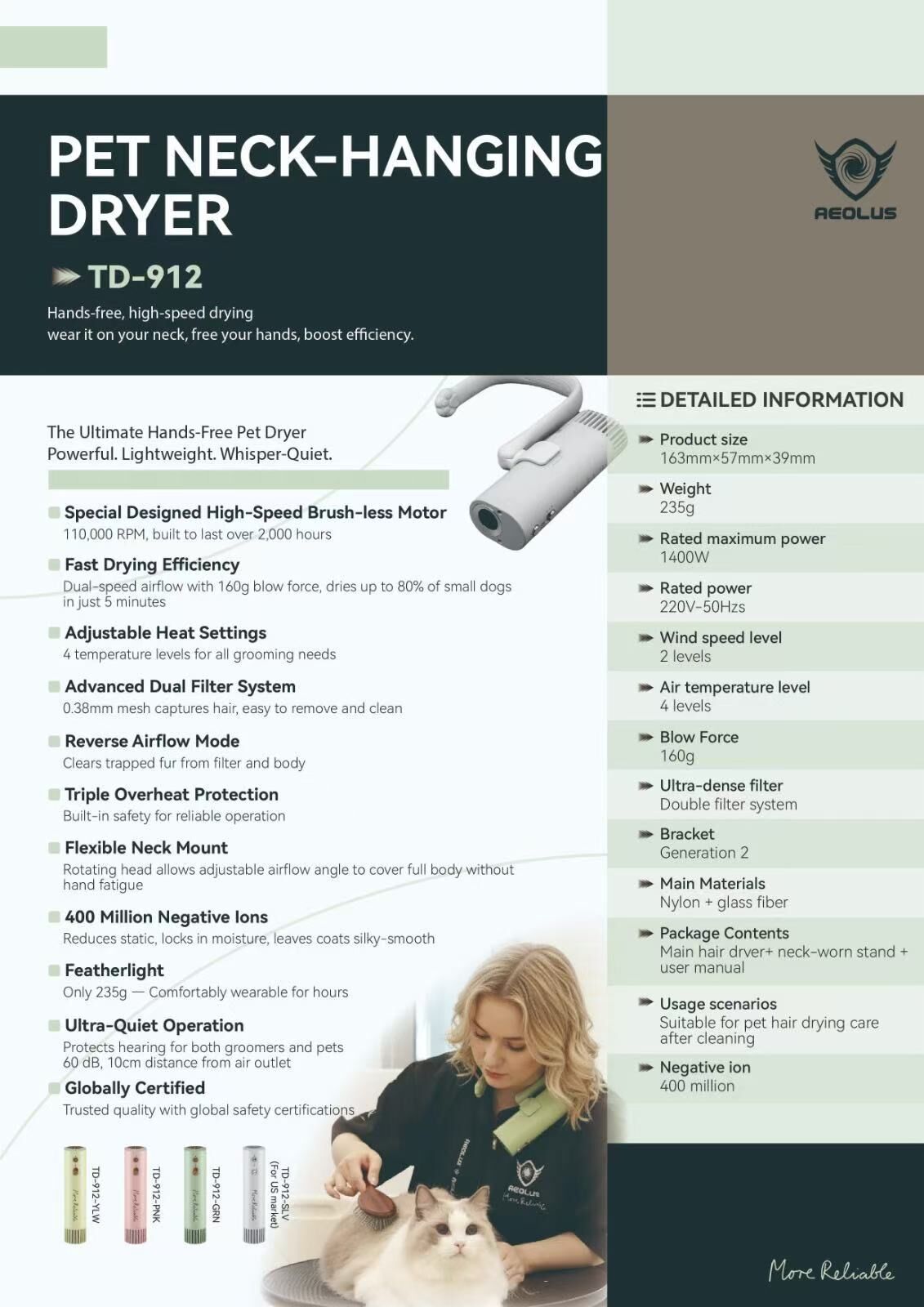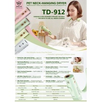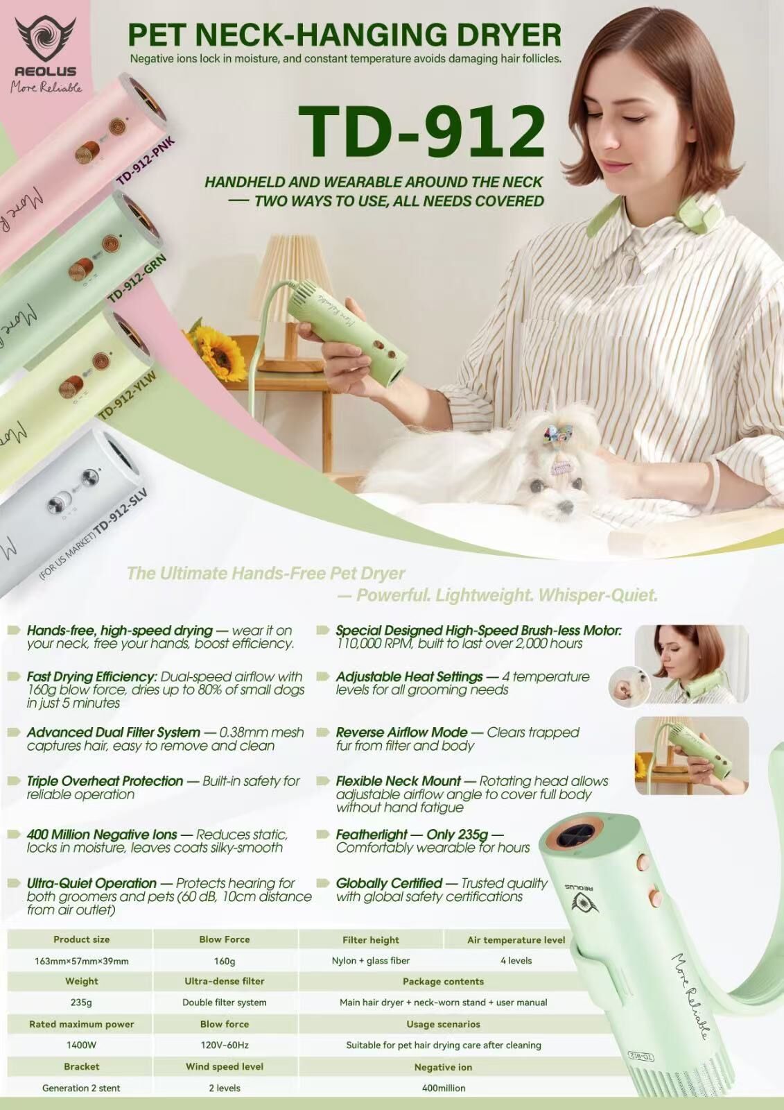 The Aeolus TD912 is the ultimate hands-free pet dryer, designed for groomers and pet owners who need both efficiency and comfort. Wearable around the neck or used handheld, it delivers powerful drying performance while keeping your hands free. With advanced negative ion technology, adjustable heat settings, and ultra-quiet operation, this lightweight dryer keeps coats smooth, shiny, and healthy without stressing pets.