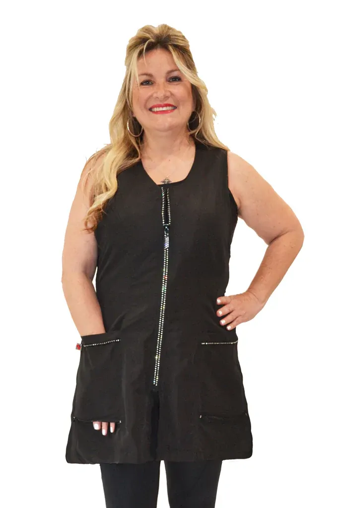Ideal for Estheticians, Pet Groomers, Nail techs, Hairstylists, Waitresses. Available in 3 sizes - S/M, M/L, L/XL. Made from high quality polyester and functional features include: water-resistant, hair resistant and bleach resistant. Rhinestone Zipper front and full back coverage with side tie belts. Deep pockets with Rhinestone trim and bottom zippers, lightweight, Iron safe.