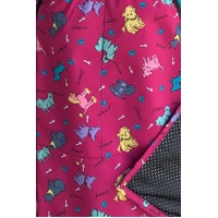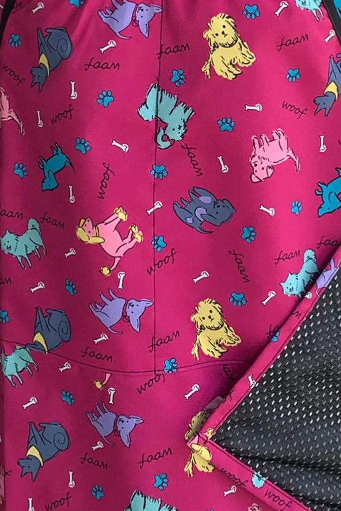 Waterproof with inside mesh lining, Pink Dog Print design styling, Bleach resistant, Hair repellent, Adjustable neck band, Black trim, 2 Front Pockets, Tie belt. One size fits most.