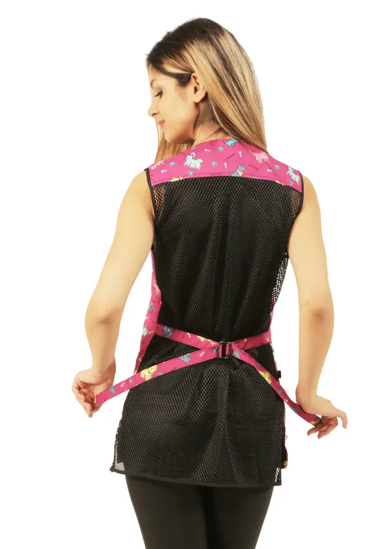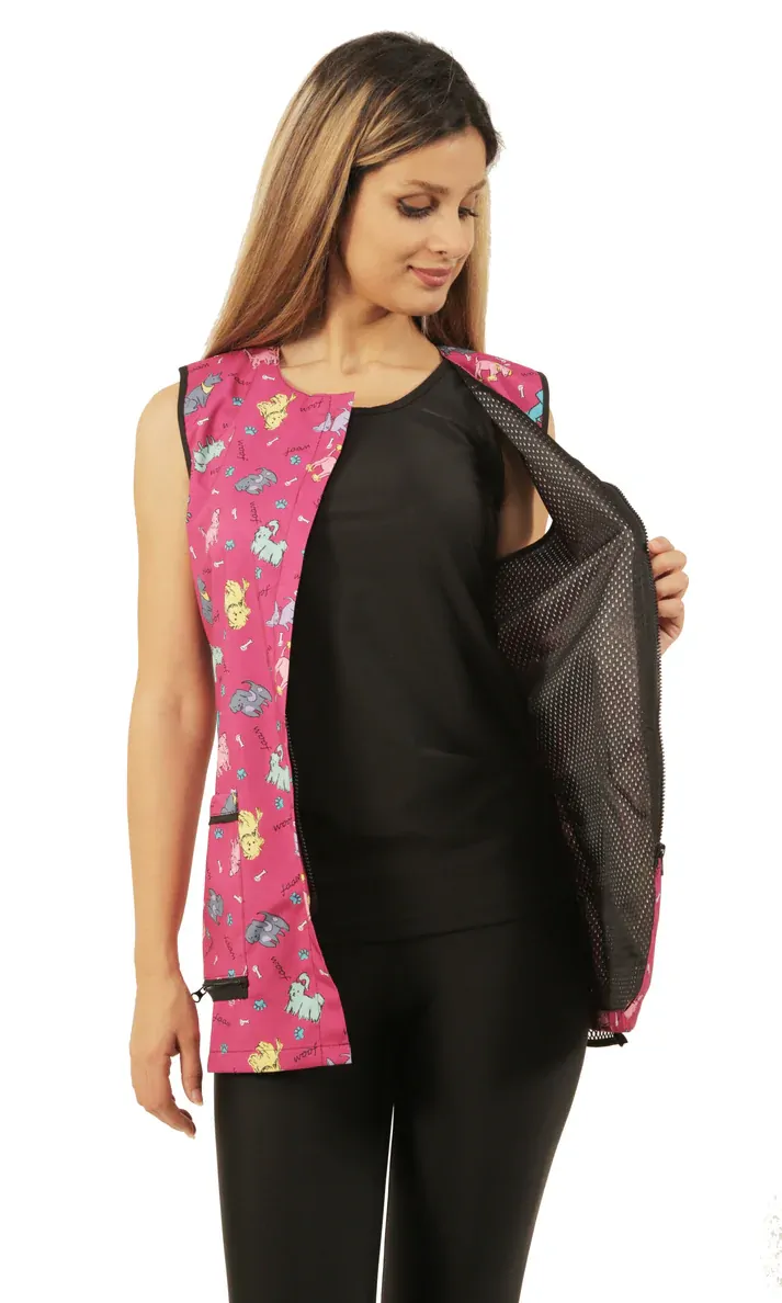 - FUNCTIONAL FASHION - These vests are lightweight waterproof, bleach resistant, hair repellent, bleach proof material, making them a staple for daily use while keeping you comfortable. Their unique mesh back design and dog design detailing ensure your style is sure to stand out and still look your best while working with clients. It also is a great compliment to the pink dog design waterproof apron.