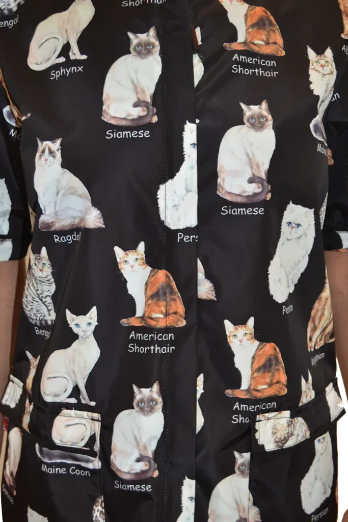 Isn’t it Puurrrfect? These functional and fashionable waterproof jackets feature 8 Feline breeds and was exclusively designed with animal lovers in mind. From the Maine Coon to the American Shorthair, we got your favorite breeds showcased. It features lightweight waterproof front panels, lapels over the pockets to help prevent the paws from entering the pockets and bottom zippers for easy hair removal. The protective zipper cover ensures you stay dry and helps to prevent zippers from breaking while leaning against the tables and the tubs. added protection. Mesh back for added breathability and to keep you cool. Designed with an adjustable belt to fit you just right and comes in sizes XS- 6XL.