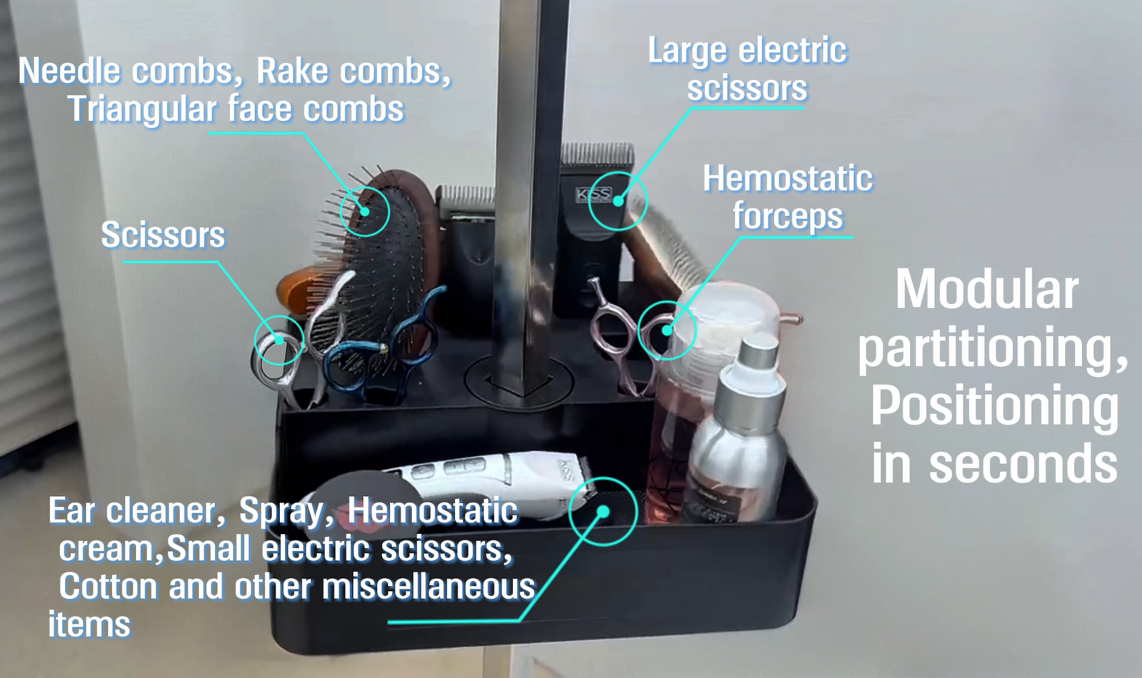 - Rotatable on the grooming arm to organize the handy tools, easy to adjust height.